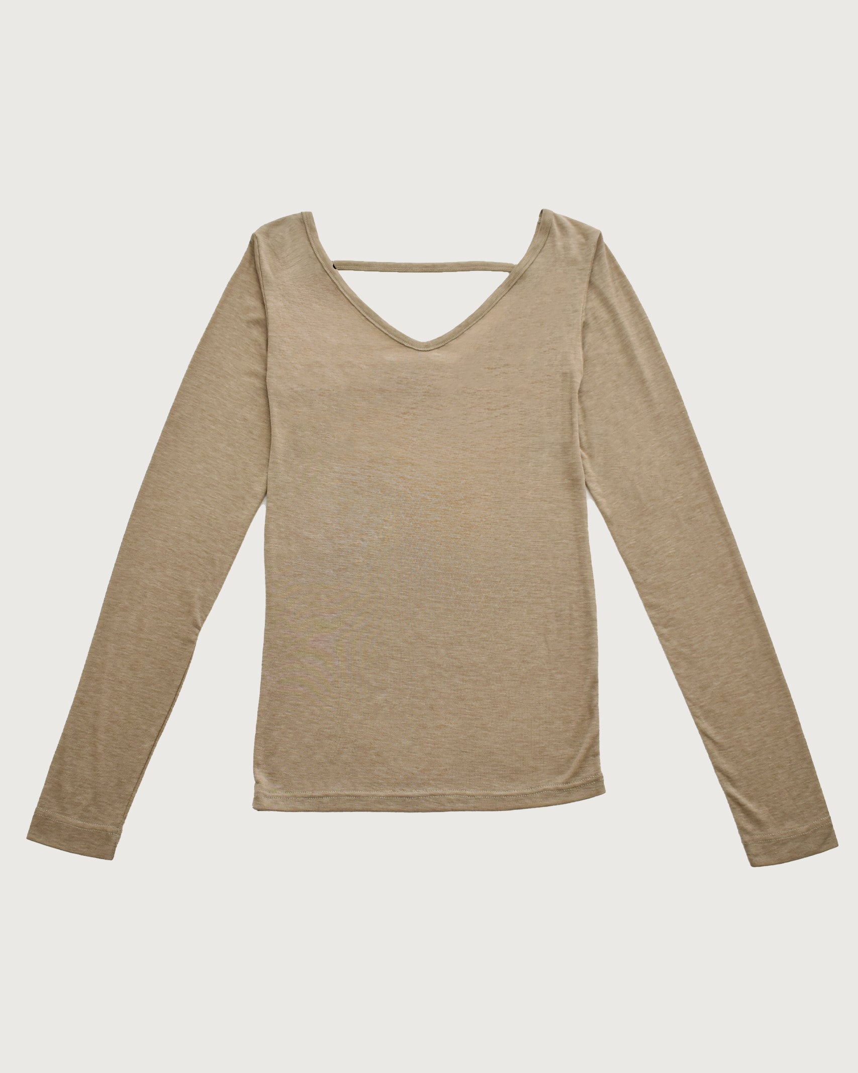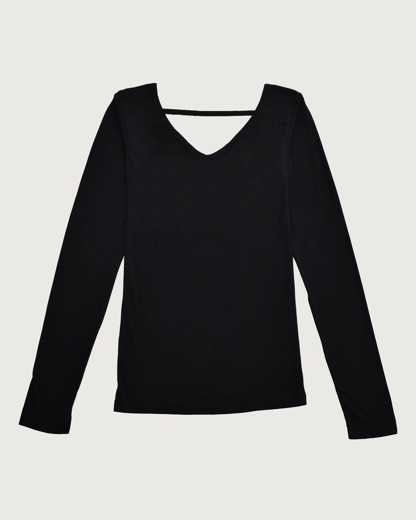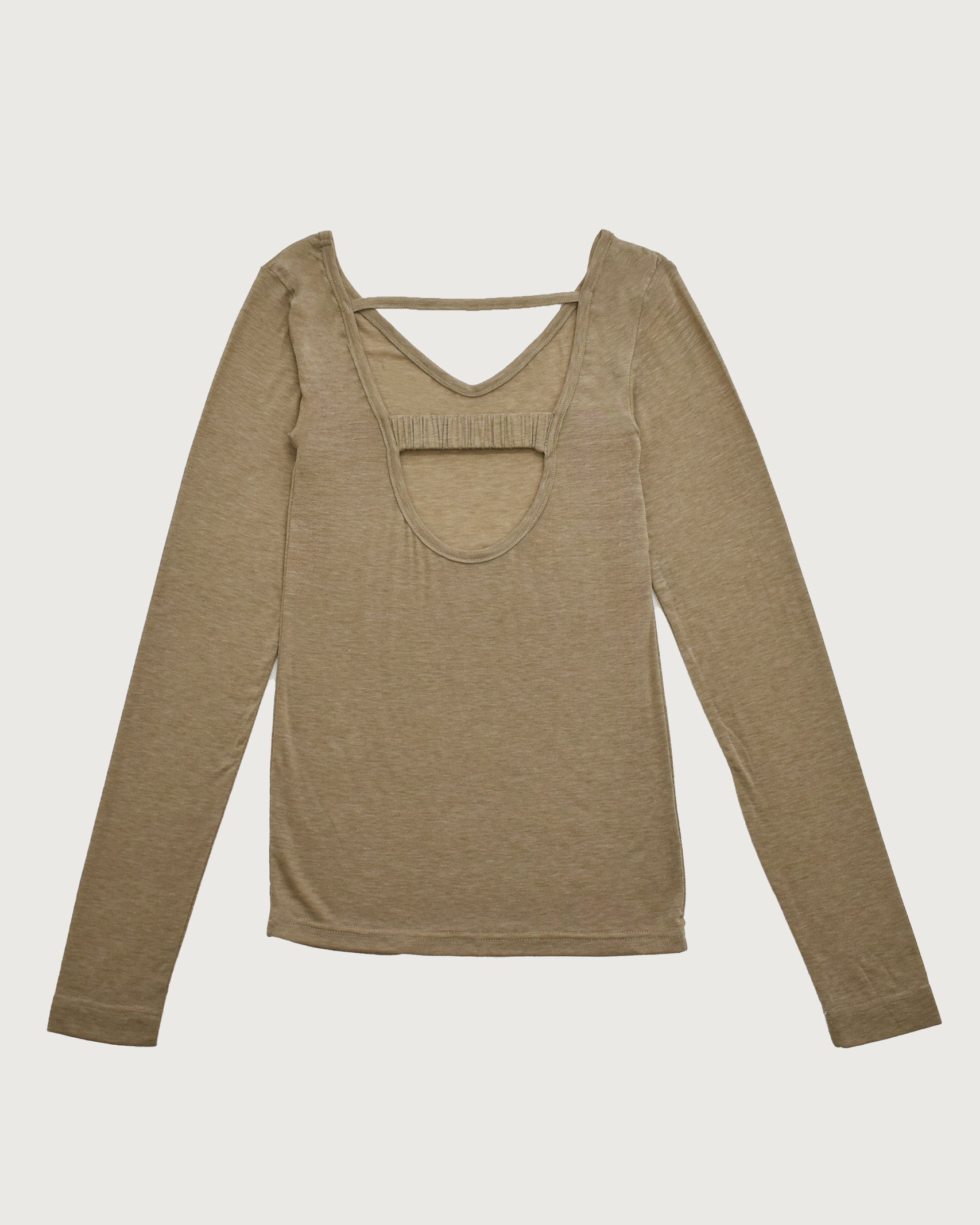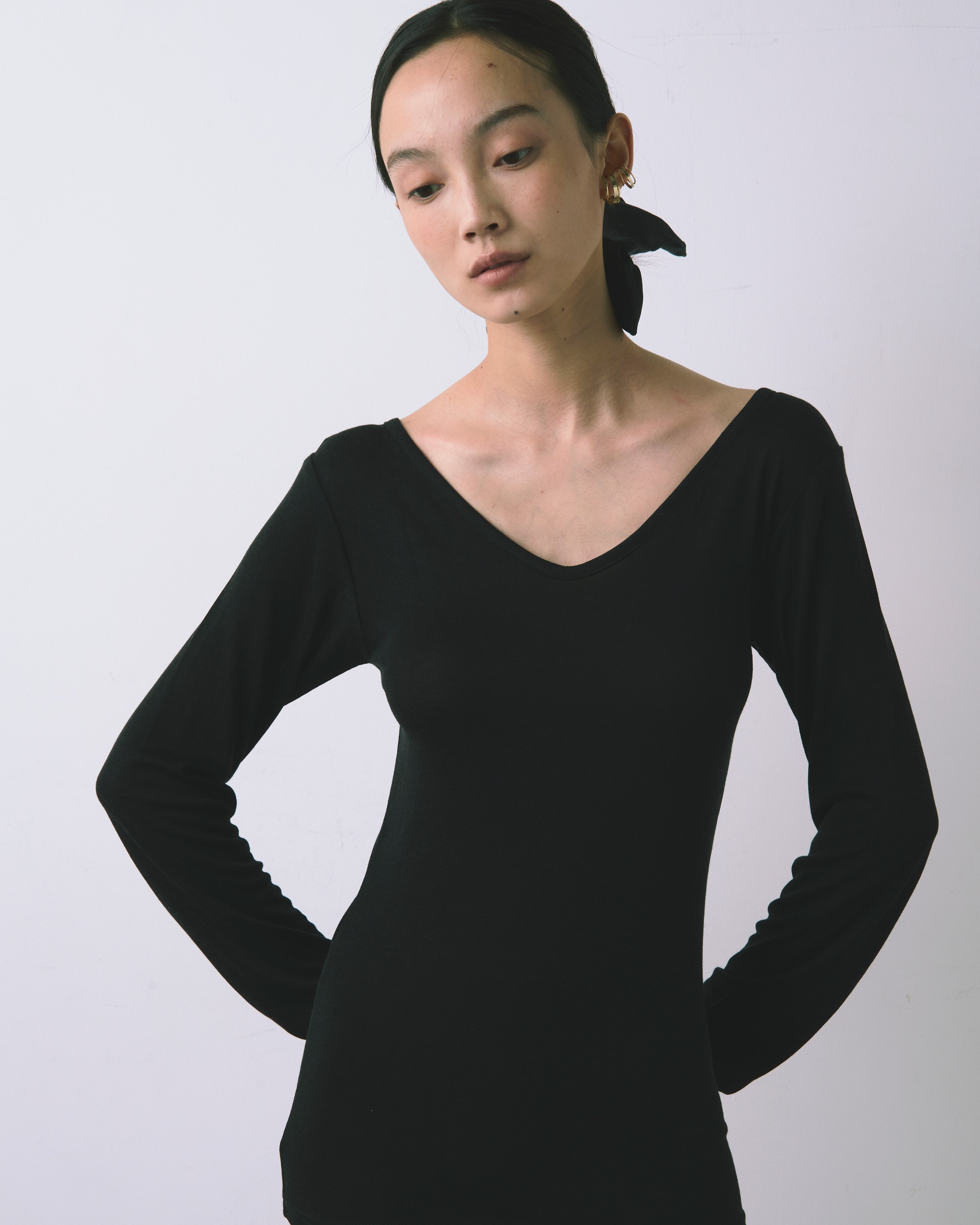 シンプルなボトムスでも、後ろ姿のデザインが主役になってくれる万能トップスです。