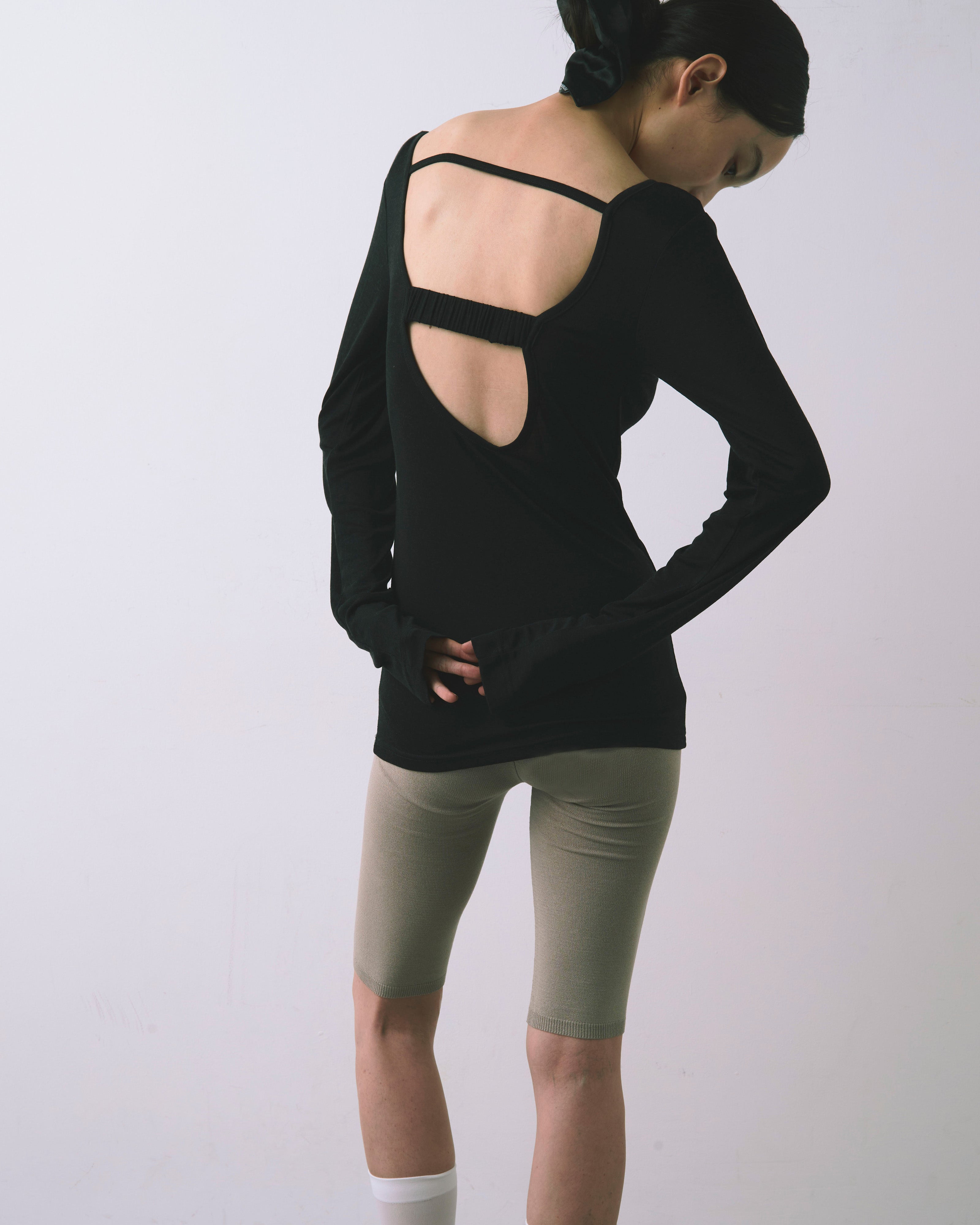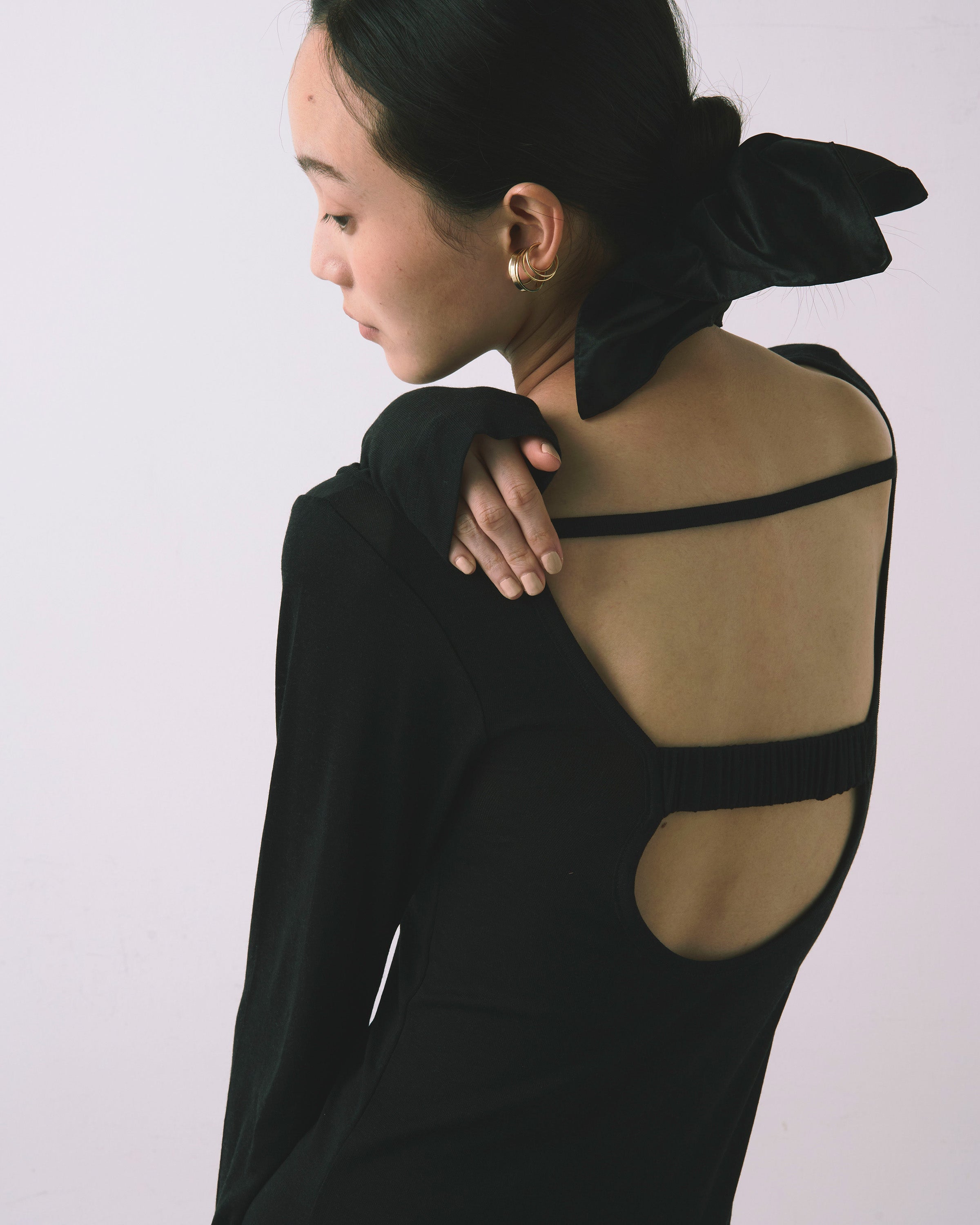 背面に大胆なデザインをあしらった、フェミニンさとモードさを両立するトップス。