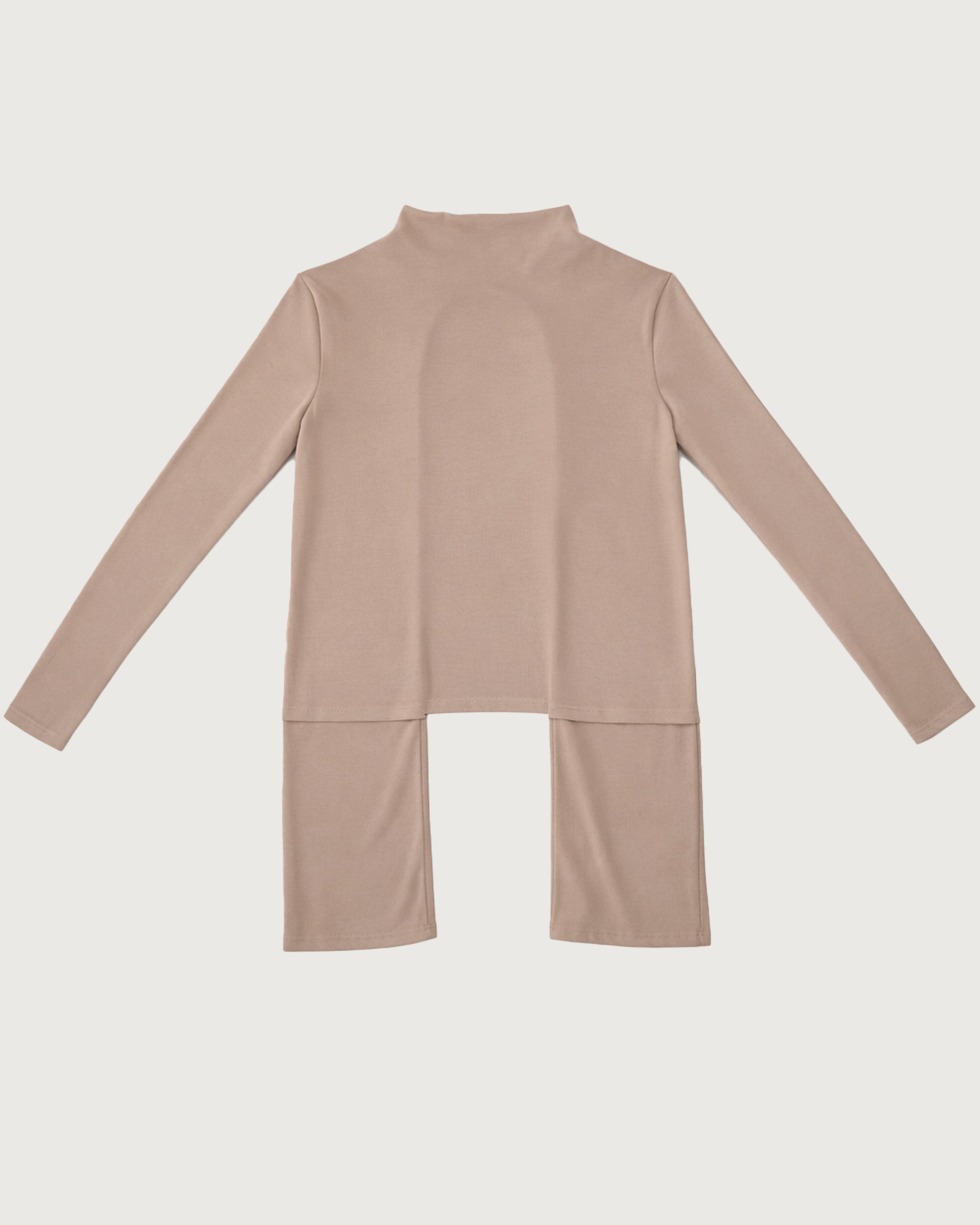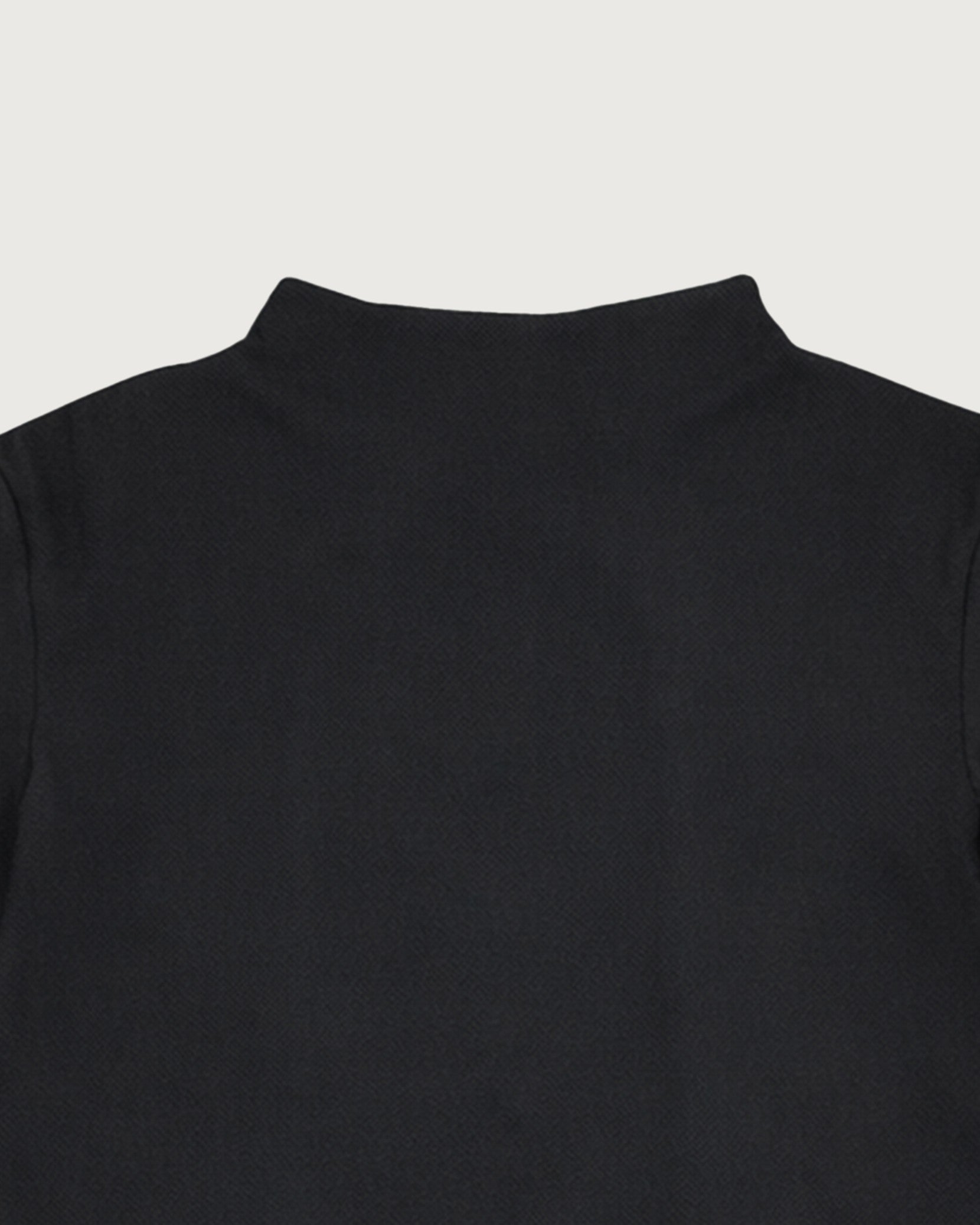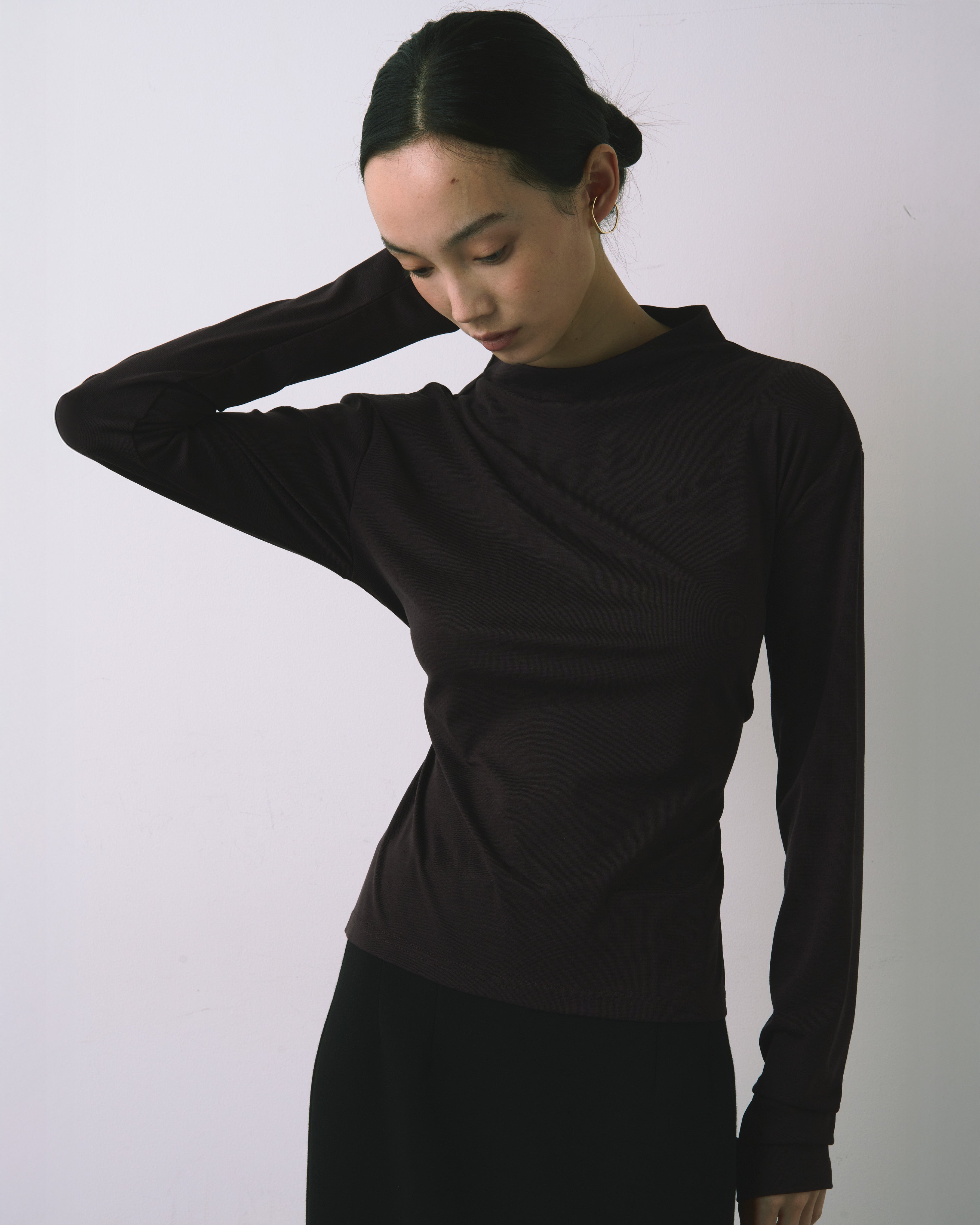 スクエアカットのスタンドネックは首にフィットしすぎない設計で、ストレスフリーな着心地。