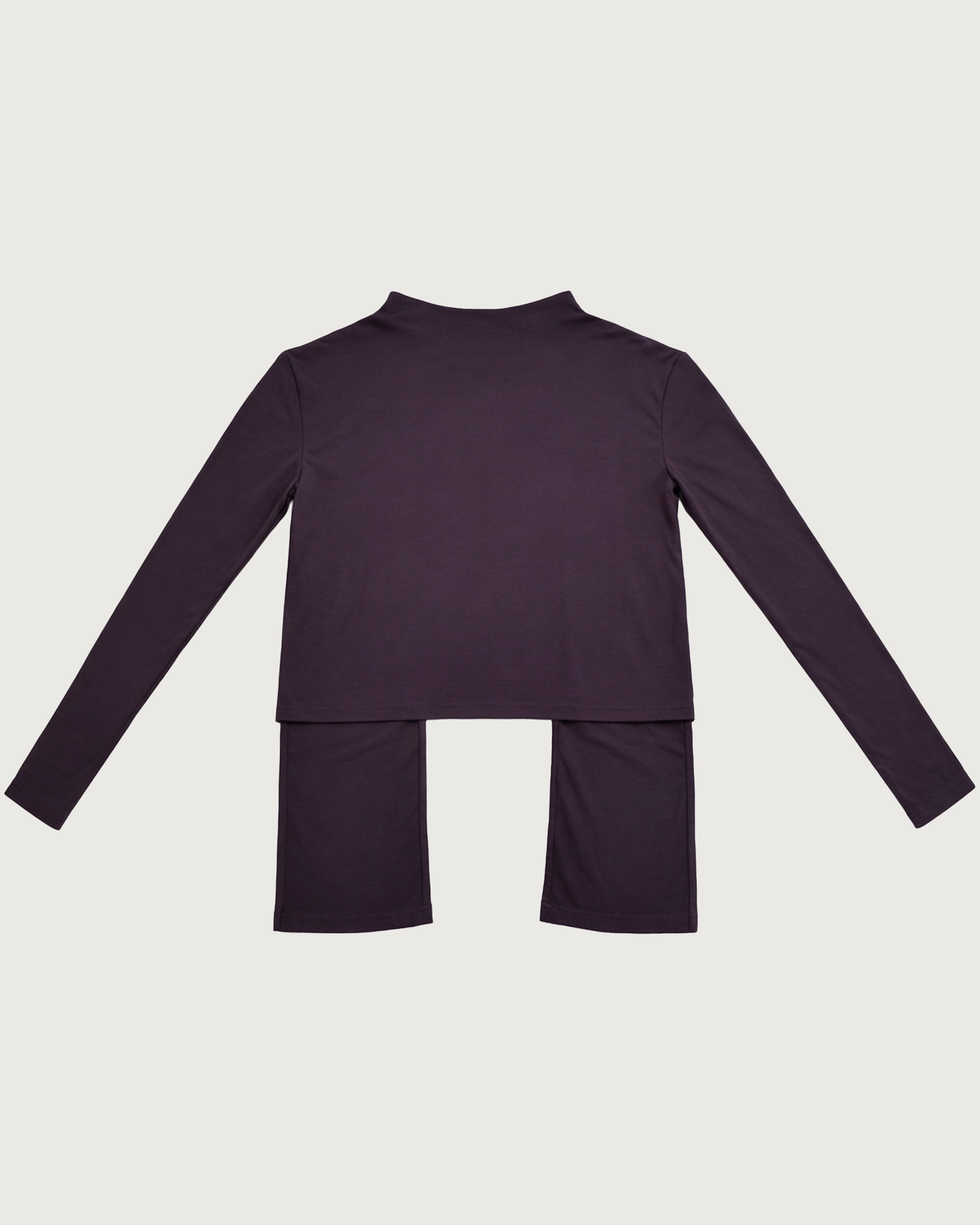 ダークパープルは奥行きのある色味で上品モードに。ブラックボトムや艶素材と合わせてシックスタイリング。
