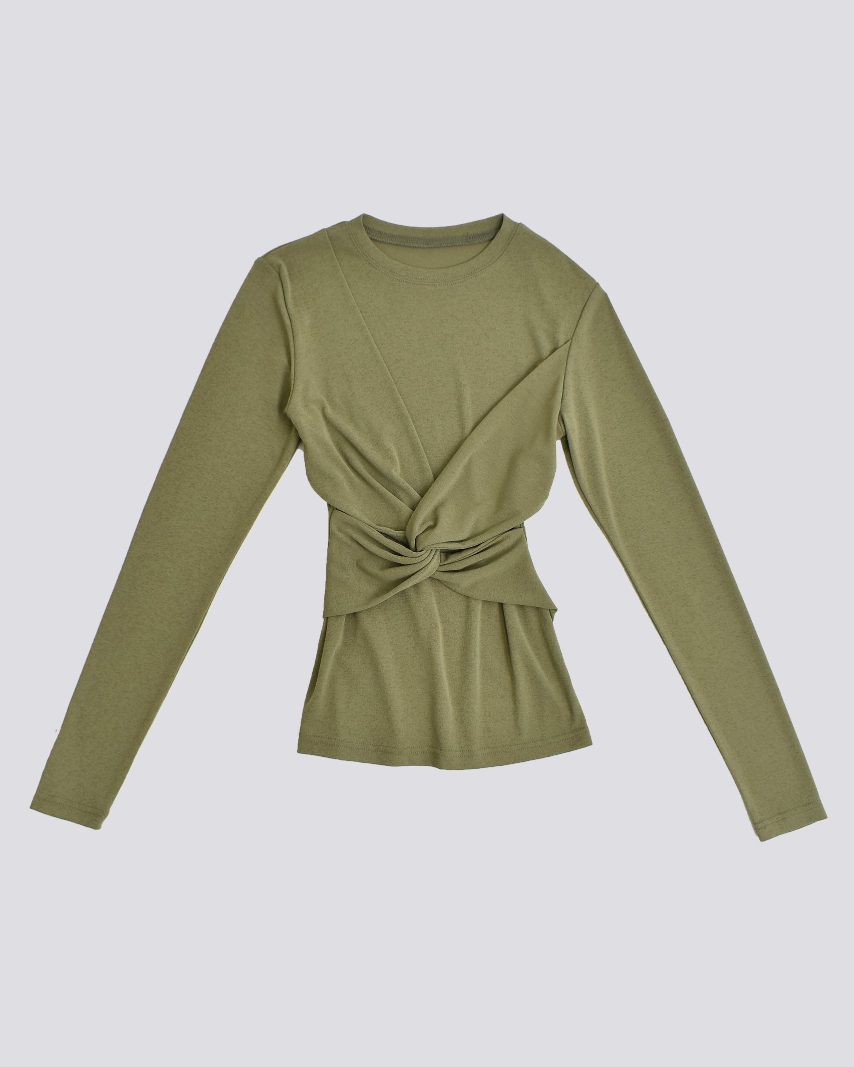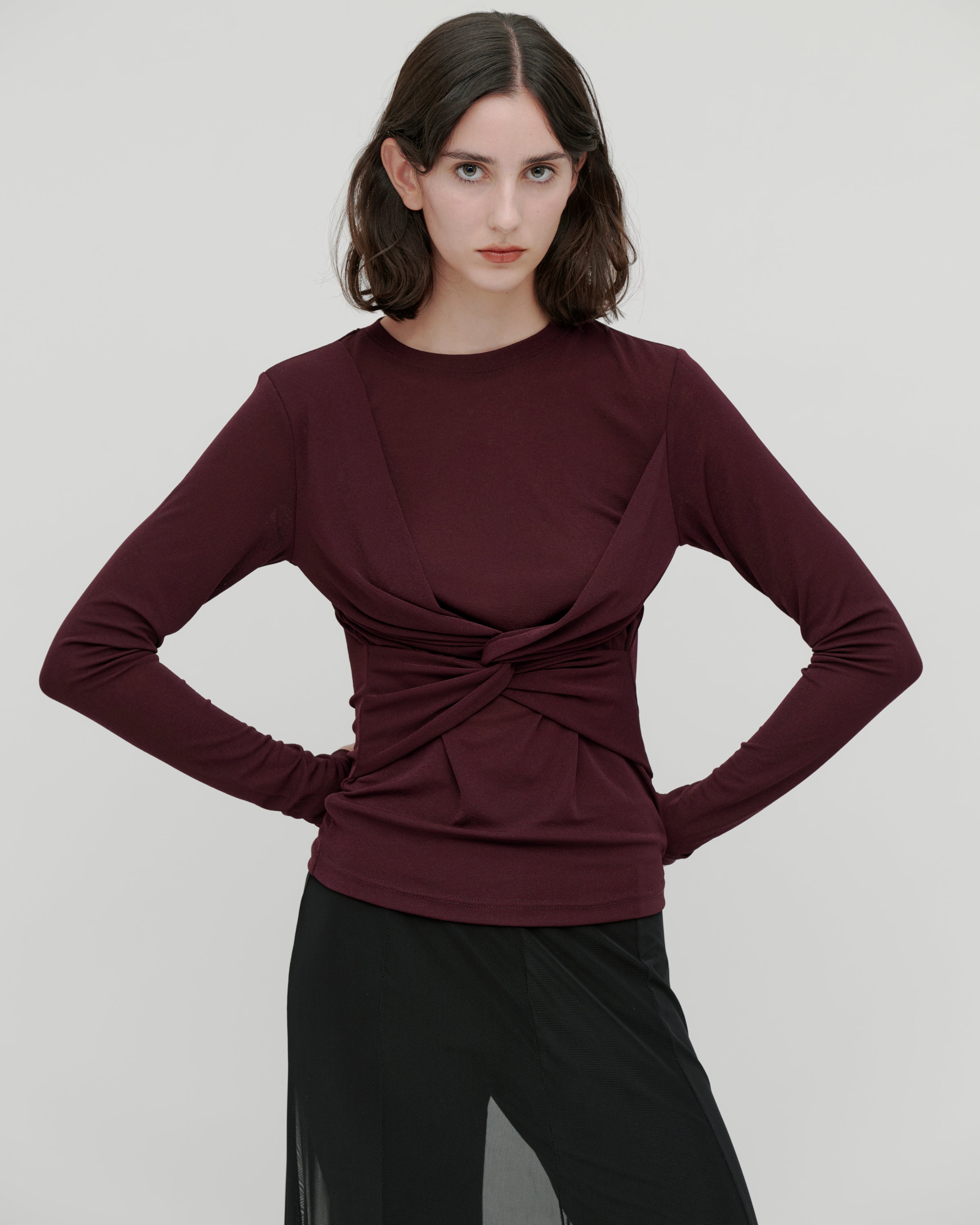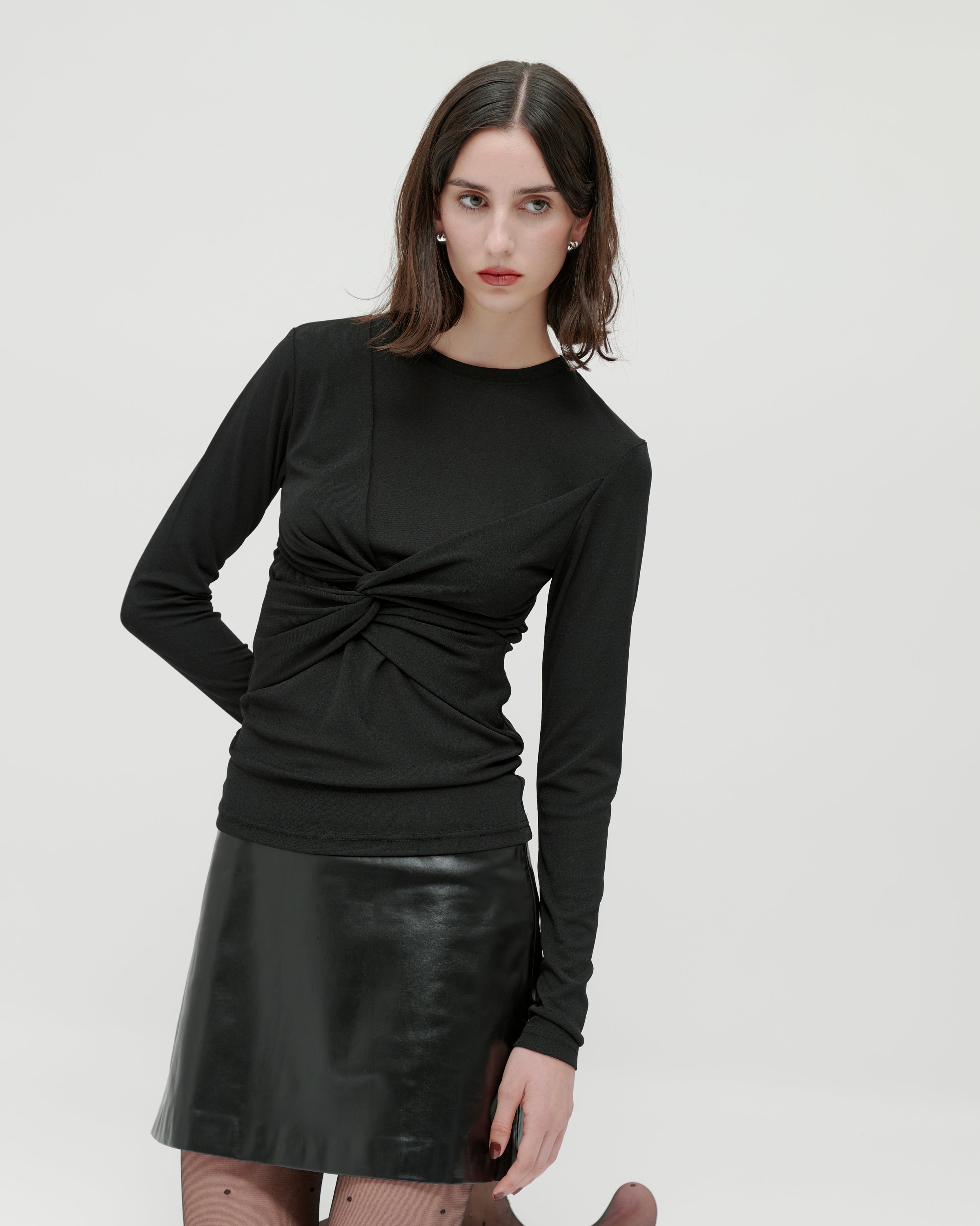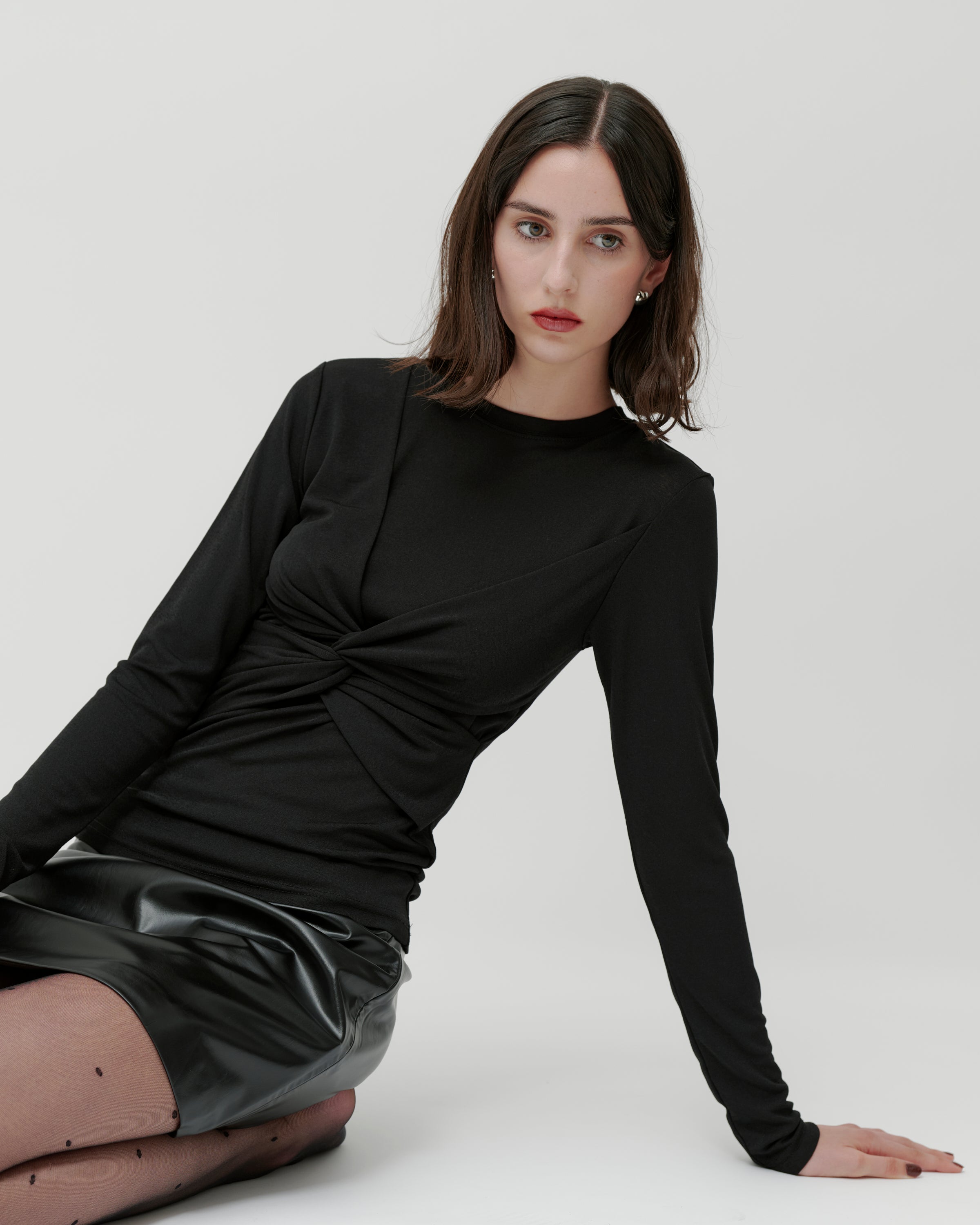 フロントの大胆なツイストデザインが主役のカットソートップス。